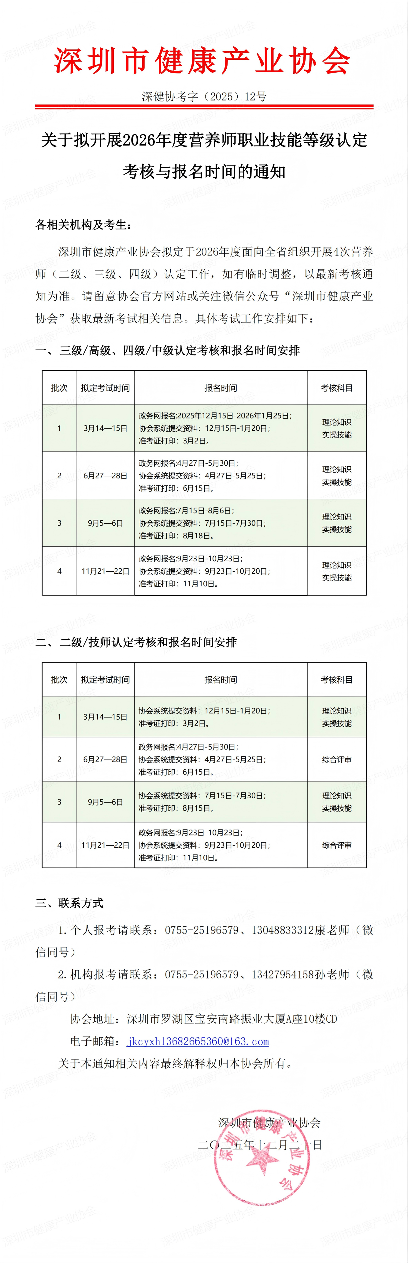 2026年度营养师职业技能等级认定考核与报名时间通知